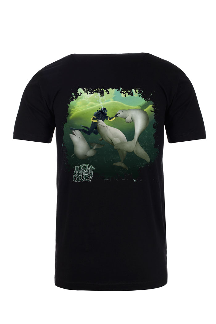 Be the envy of other divers and sport our super-soft, lightweight fitted scuba shirt around town. Made with 100% combed ring-spun cotton, our Beluga dive shirt is built with the utmost durability and with colors that stay true. Each scuba t-shirt has the Just Gotta Dive logo printed on the front left chest and three beluga whales frolicking with a scuba diver submerged beneath the icy water printed on the back. Order your Beluga scuba tee today!