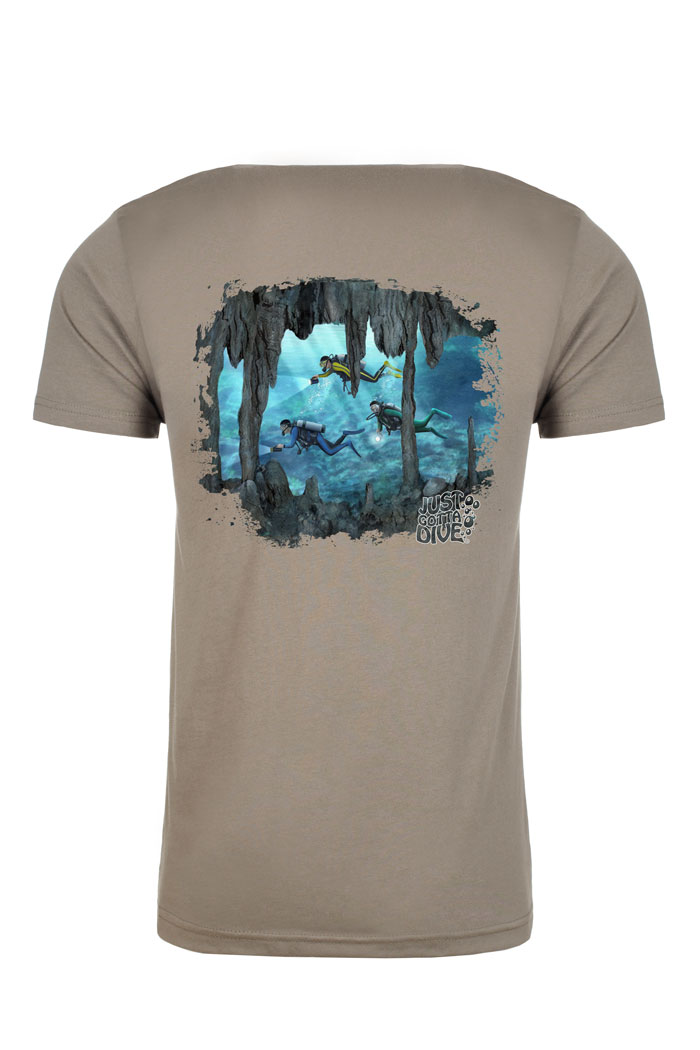 Be the envy of other divers and sport our super-soft, lightweight fitted scuba shirt around town. Made with 100% combed ring-spun cotton, our Cenote dive shirt is built with the utmost durability and with colors that stay true. Each scuba t-shirt has the Just Gotta Dive logo printed on the front left chest and three divers using their dive lights to highlight the astounding stalactites of a popular cenote printed on the back. Order your Cenote scuba tee today!
