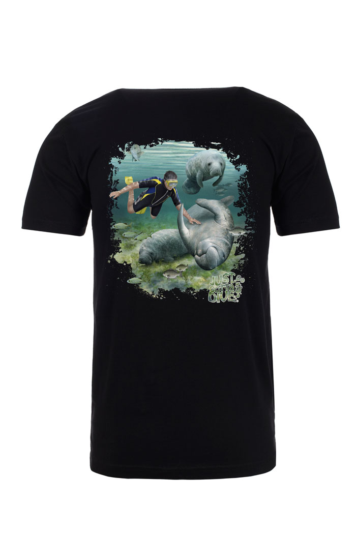 Be the envy of other divers and sport our super-soft, lightweight fitted scuba shirt around town. Made with 100% combed ring-spun cotton, our Manatee dive shirt is built with the utmost durability and with colors that stay true. Each scuba t-shirt has the Just Gotta Dive logo printed on the front left chest and a diver rubbing the belly of a playful manatee as other manatees wait for their turn printed on the back. Order your Manatee scuba tee today!