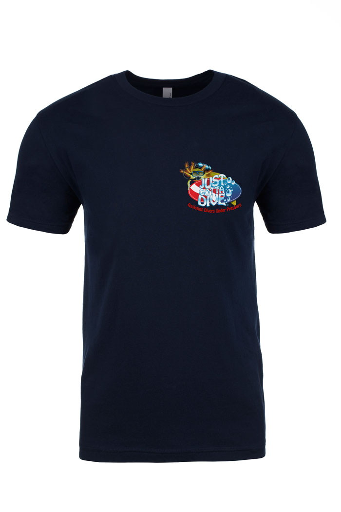 Be the envy of other divers and sport our super-soft, lightweight fitted scuba shirt around town. Made with 100% combed ring-spun cotton, our Shark Cage dive shirt is built with the utmost durability and with colors that stay true. Each scuba t-shirt has the Just Gotta Dive logo printed on the front left chest and a shark cage full of divers surrounded by great whites in a feeding frenzy printed on the back. Order your Shark Cage scuba tee today!