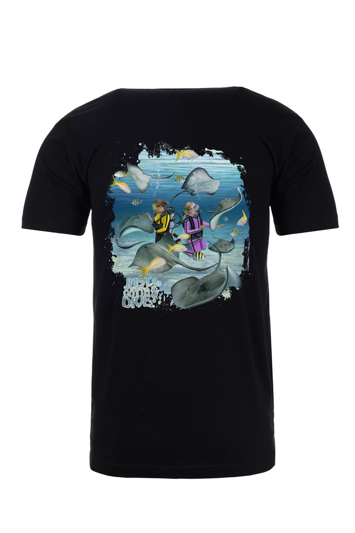 Be the envy of other divers and sport our super-soft, lightweight fitted scuba shirt around town. Made with 100% combed ring-spun cotton, our Stingray dive shirt is built with the utmost durability and with colors that stay true. Each scuba t-shirt has the Just Gotta Dive logo printed on the front left chest and two female divers kneeling in the sand surrounded by a group of stingrays hoping to get fed printed on the back. Order your Stingray scuba tee today!